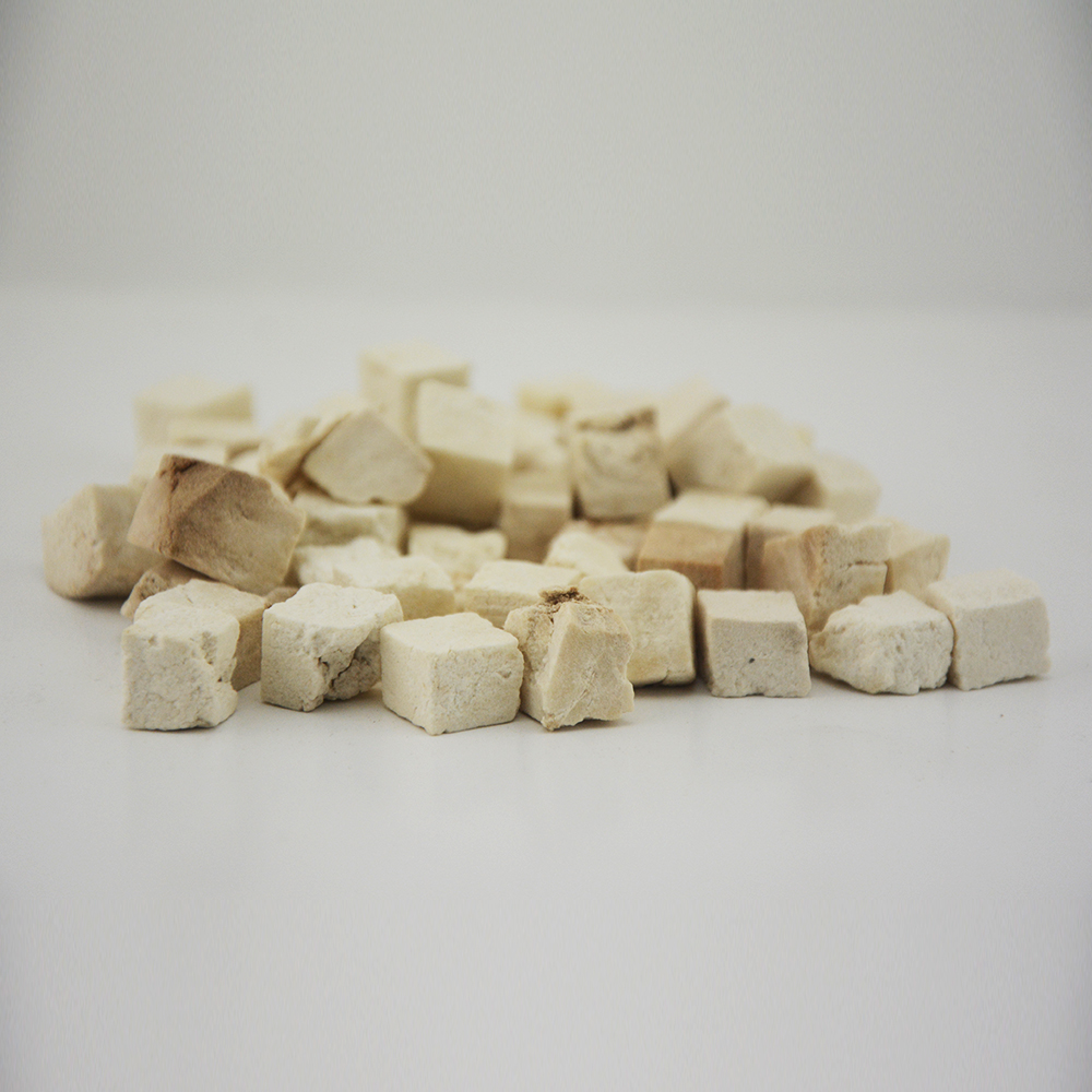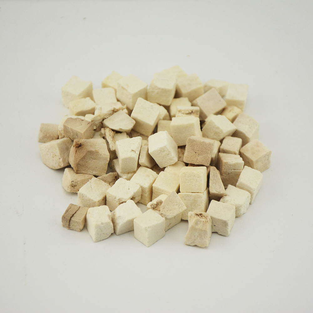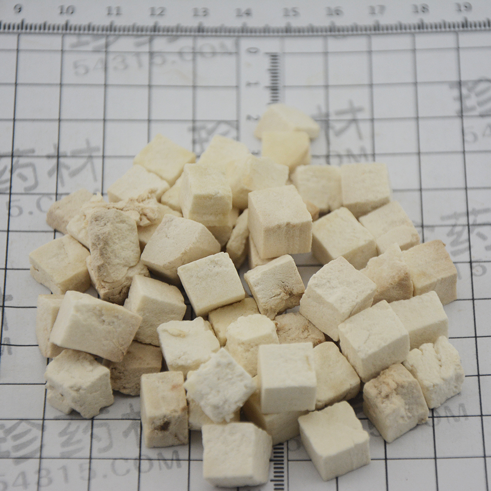 体重,质坚实,断面颗粒性,有的具裂隙,外层淡棕色,内部白色,气微,味淡,嚼之粘牙。本品厚0.7cm左右,长宽各0.7cm左右。