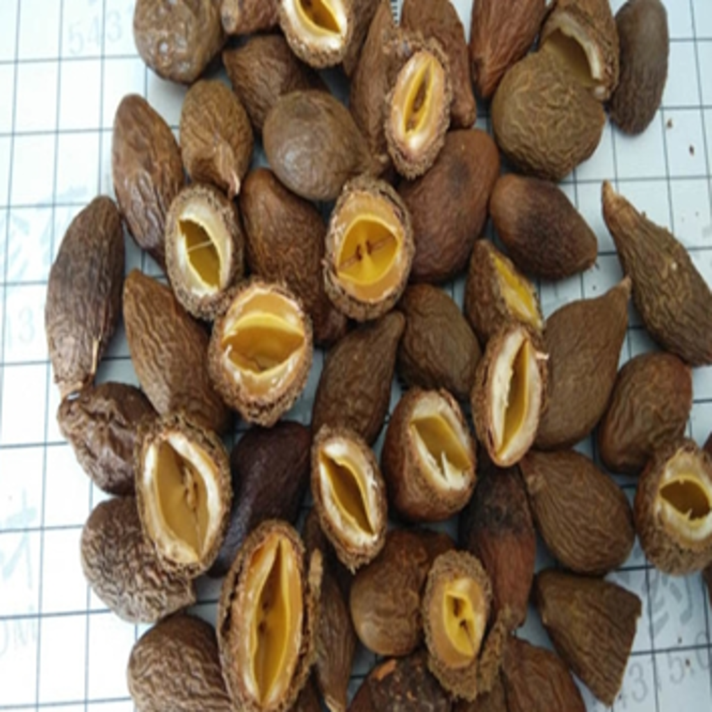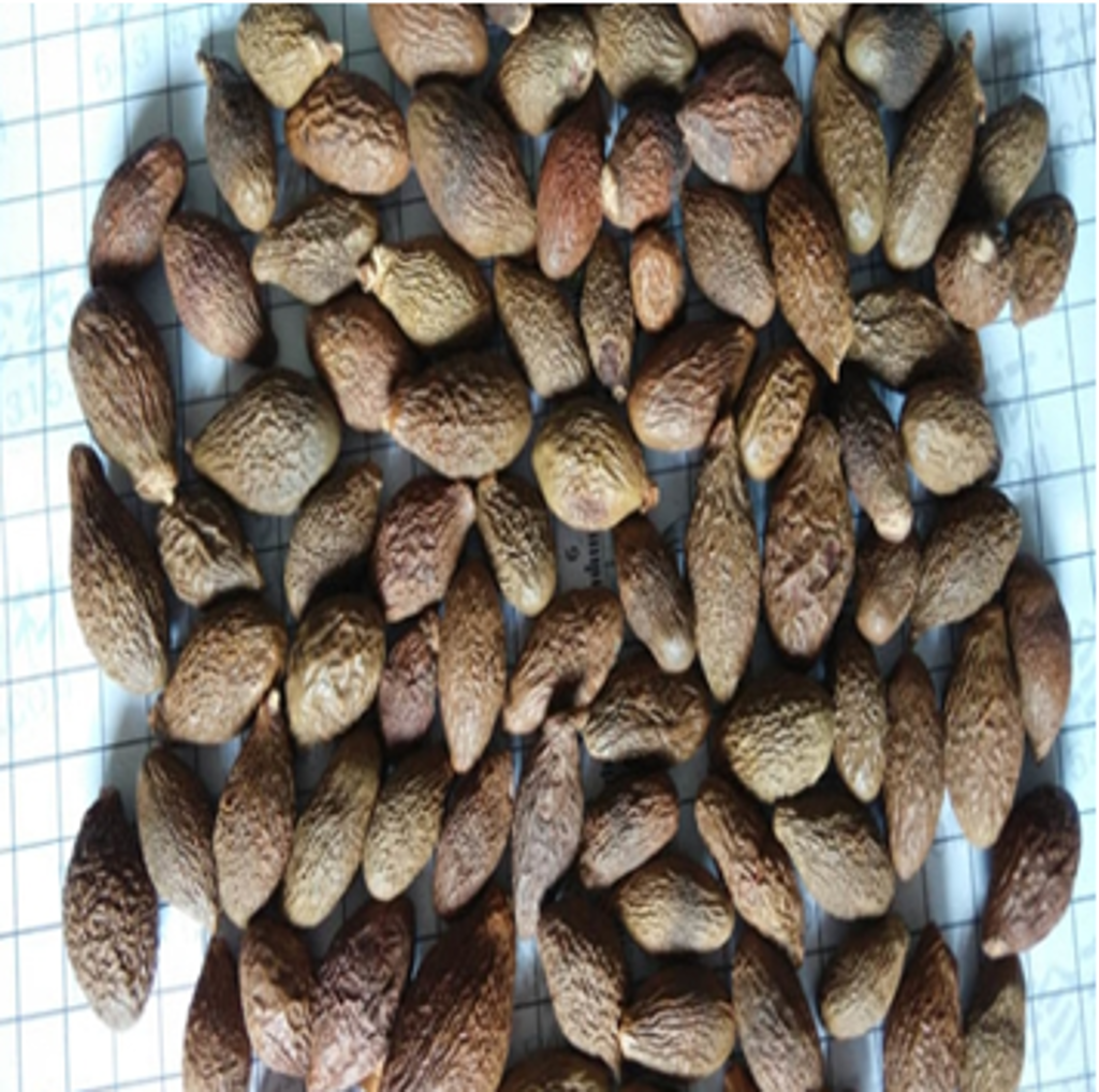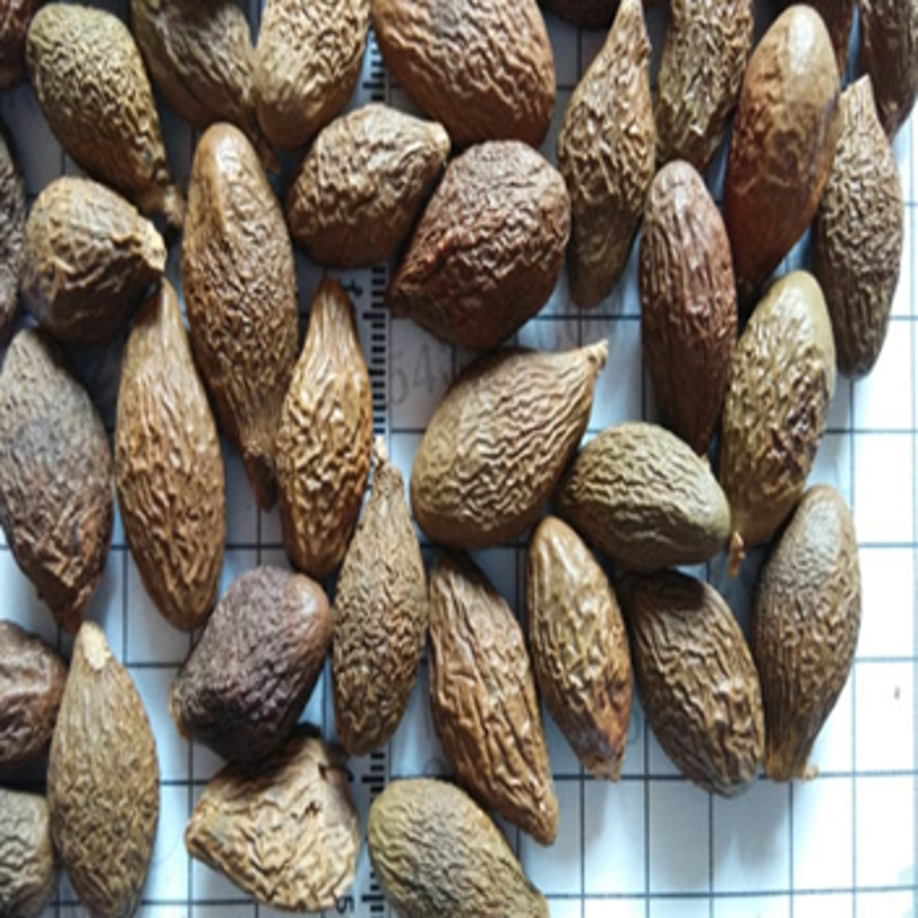 先端钝圆,基部略尖而歪,具浅色的圆形种脐,表面棕色或暗棕色,微有光泽,具不规则的干缩皱纹。外层种皮极薄,质脆,易脱落。中层种皮较厚,黑褐色,质松易碎,遇水膨胀成海绵状。
