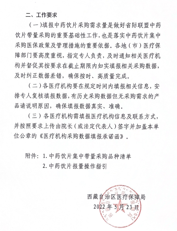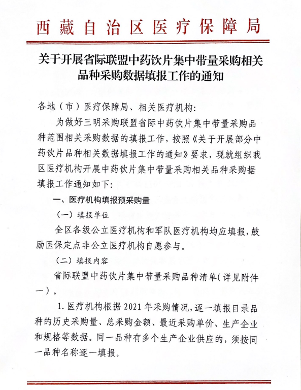 5月23日,西藏自治区医疗保障局发布了《关于开展省际联盟中药饮片集中带量采购相关品种采购数据填报工作的通知》,这是在山东互联网中药材交易中心首次发布中药饮片品种相关数据填报工作的通知后,又一地发布中药饮片联盟集采报量消息。