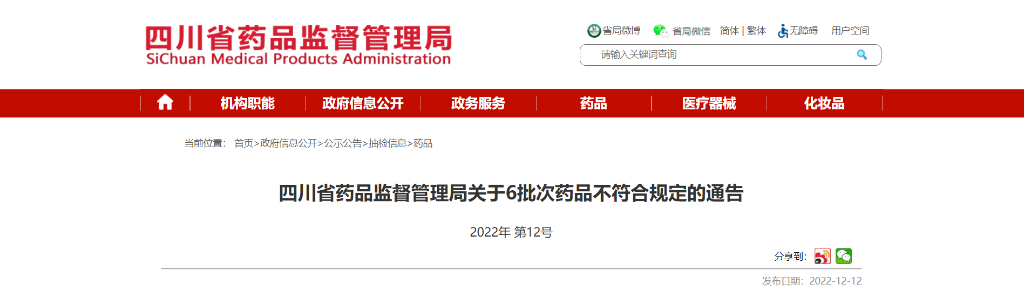四川省药品监督管理局关于6批次药品不符合规定的通告
