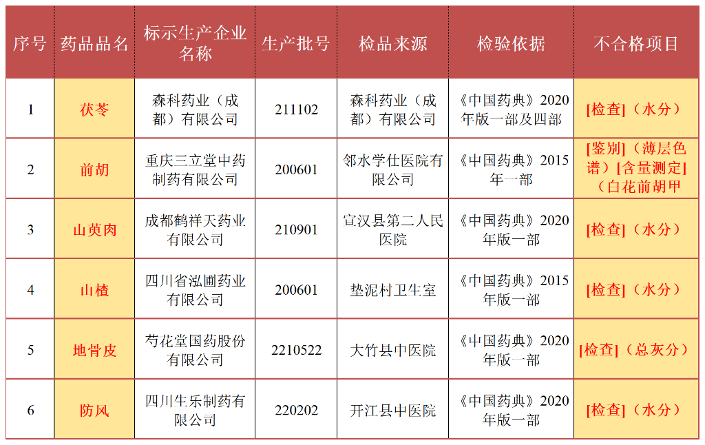 12月12日,四川药监局发布了《四川省药品监督管理局关于6批次药品不符合规定的通告》,共6批饮片抽检不合格:茯苓([检查](水分)),前胡([鉴别](薄层色谱)[含量测定](白花前胡甲素)),山萸肉([检查](水分)),山楂([检查](水分)),地骨皮([检查](总灰分)),防风([检查](水分))。