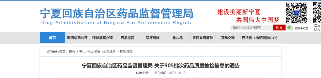 宁夏回族自治区药品监督管理局关于905批次药品质量抽检信息的通告