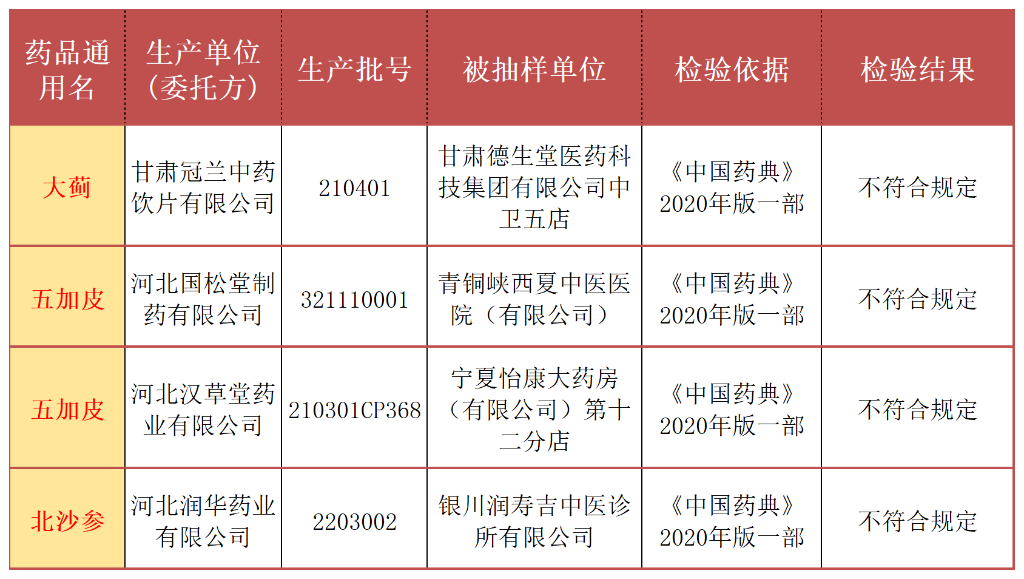 12月15日,宁夏药监局发布了关于905批次药品质量抽检信息的通告,本次通告涉及494个品种905批次药品,其中4批次药品不符合规定,均为中药饮片:大蓟、五加皮(2批次)、北沙参。