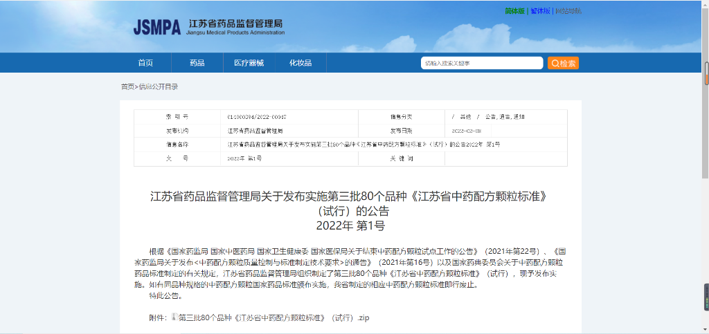 2月8日,江苏省药品监督管理局关于发布实施第三批80个品种《江苏省中药配方颗粒标准》(试行)的公告2022年 第1号