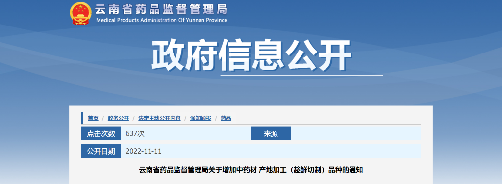 云南省药品监督管理局关于增加中药材 产地加工(趁鲜切制)品种的通知