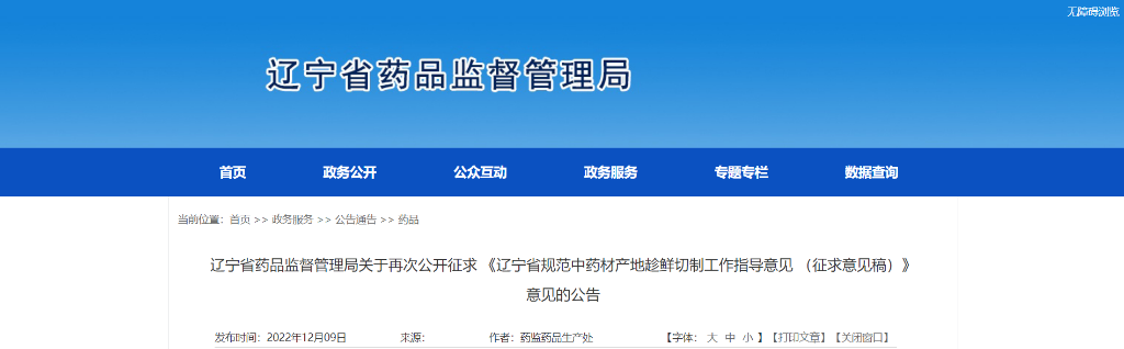 辽宁省药品监督管理局关于再次公开征求 《辽宁省规范中药材产地趁鲜切制工作指导意见 (征求意见稿)》意见的公告