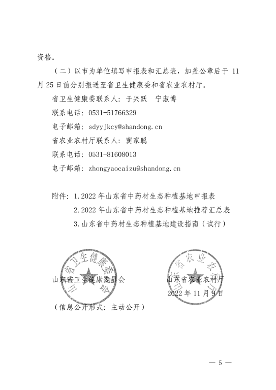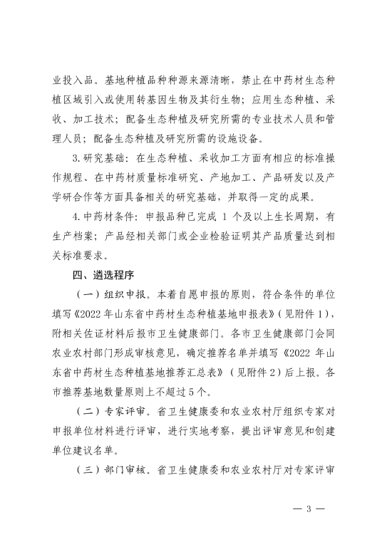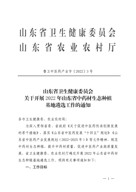 日前,山东省卫生健康委、省农业农村厅联合印发《关于开展2022年山东省中药材生态种植基地遴选工作的通知》。