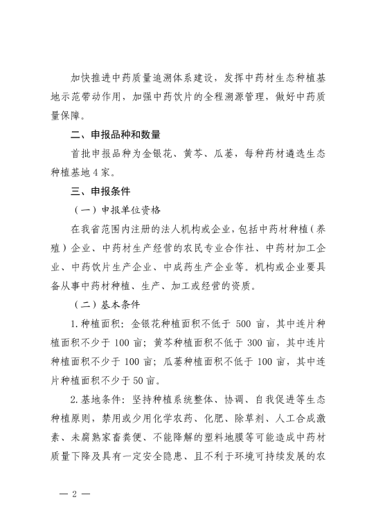《通知》明确,首批申报品种为金银花、黄芩、瓜蒌,每种药材遴选生态种植基地4家,申报单位种植金银花、黄芩、瓜蒌面积分别不低于500亩、300亩、100亩;坚持整体、协调、自我促进等生态种植原则,应用生态种植、采收、加工技术;在中药材质量标准研究、产地加工、产品研发以及产学研合作等方面具备相关的研究基础,并取得一定的成果等。