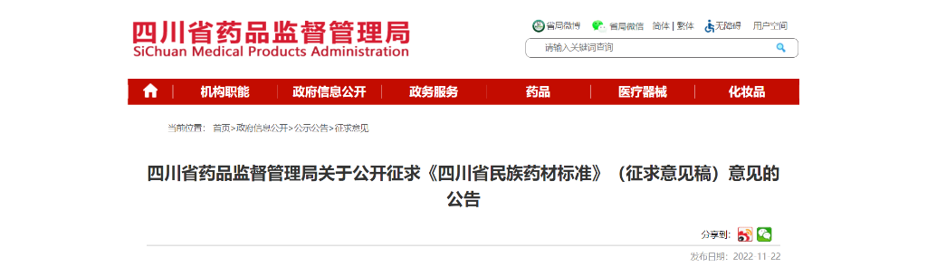 四川省药品监督管理局关于公开征求《四川省民族药材标准》(征求意见稿)意见的公告