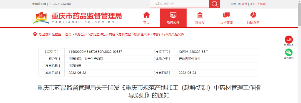 1.市药监局制定《重庆市规范产地加工(趁鲜切制)中药材管理工作指导原则》,规范全市用于中药饮片生产的产地加工(趁鲜切制)中药材管理。