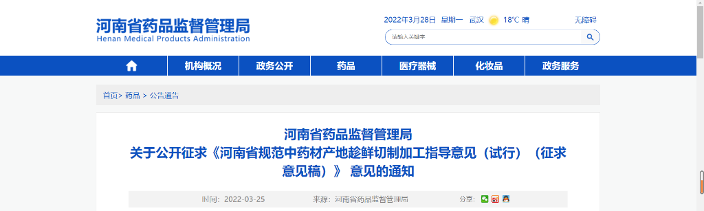 3月25日,河南省药监局发布了《河南省规范中药材产地趁鲜切制加工指导意见(试行)(征求意见稿)》,公开征求意见。并将丹参、柴胡、生地黄、山药、桔梗、白芷、黄芩、山楂、黄精、牛膝、何首乌、茯苓、商陆等13个品种列为《河南省产地趁鲜切制加工中药材品种目录(第一批)》。
