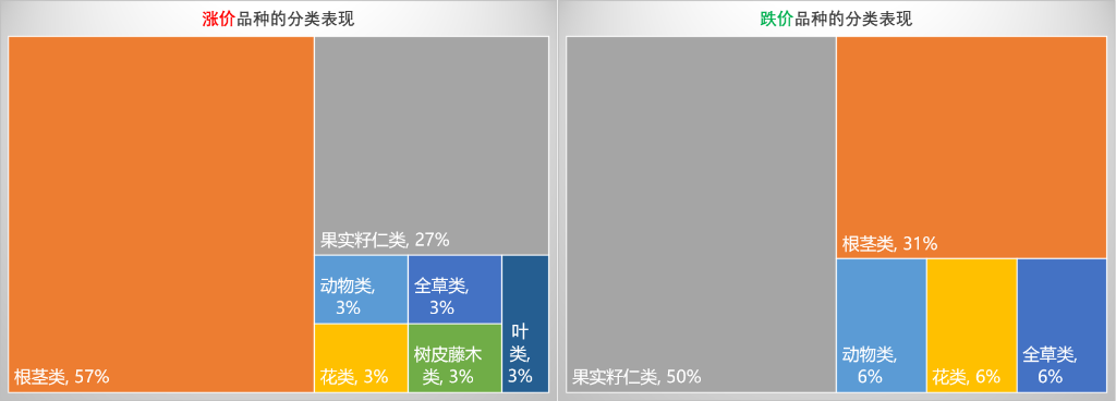(1)本期上涨价品种共计30个,下跌品种共计16个,另有102品种与上期保持持平。价格上涨品种与下跌品种的数量比值大于2:1,其中涨价品种中根茎类数量占比57%,如川芎、当归、黄芩、龙胆、人参、西洋参、细辛等;跌价品种中果实籽仁类药材数量占比50%, 如:八角茴香、豆蔻、枸杞子、海金沙、五味子、韭菜子等。