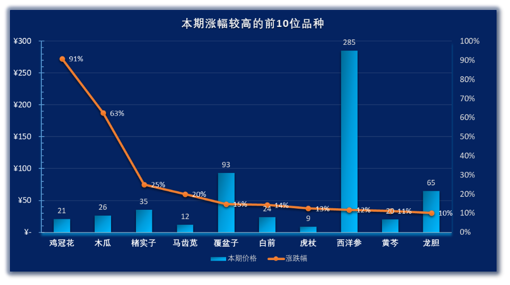 (1)本期价格行情上涨品种的前10位主要有:鸡冠花、木瓜、楮实子、马齿苋、覆盆子、白前、虎杖、西洋参、黄芩、龙胆等。