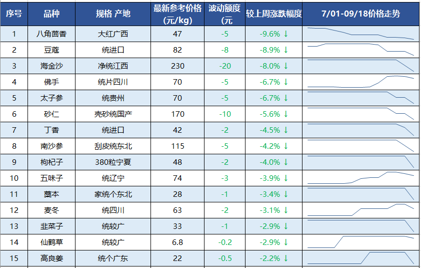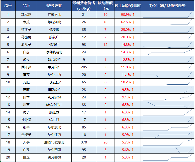 (2)本期共30个品种涨价,涨幅由高向低递减即鸡冠花、木瓜、楮实子、马齿苋、覆盆子、白前、虎杖、西洋参等,下跌共计16个品种,跌幅由高向低递减即八角茴香、豆蔻、海金沙、佛手、太子参、砂仁、丁香、南沙参、枸杞子等。另有102个品种与上期保持持平。