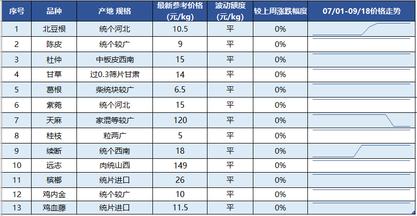 (1)本期价格行情平稳品种主要有:北豆根、陈皮、鸡内金、杜仲、甘草、槟榔等。