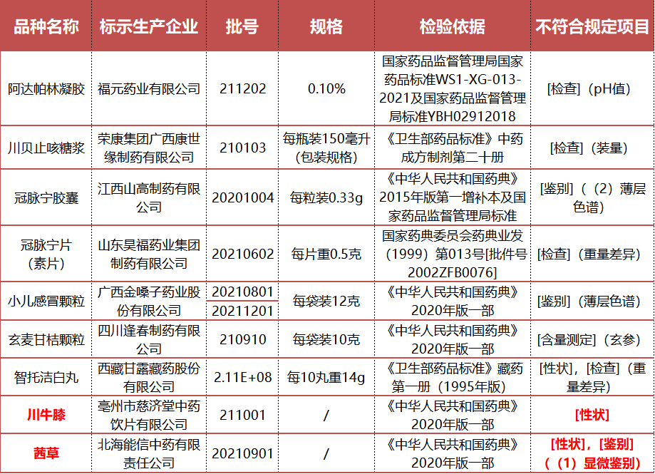 6月20日,国家药监局发布了《国家药监局关于10批次药品不符合规定的通告(2022年第27号)》,包括2个中药饮片(括号为不合格项目):川牛膝(性状)、茜草(性状、鉴别)。