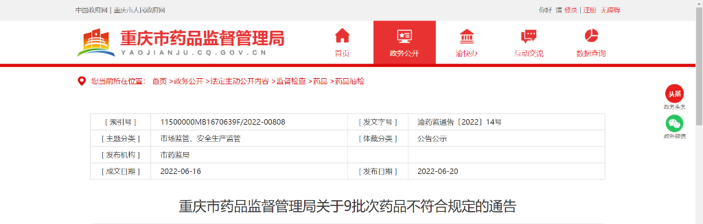 6月20日,重庆药监局发布了《重庆市药品监督管理局关于9批次药品不符合规定的通告》,共9批次不符合规定,全部为中药饮片(括号为不合格项目),分别是:全蝎(水分、总灰分)、银杏叶(含量测定)、红花(含量测定)、红参片(农药残留量)、苍术(含量测定)、牡蛎(含量测定)、山柰(检查和含量测定)。