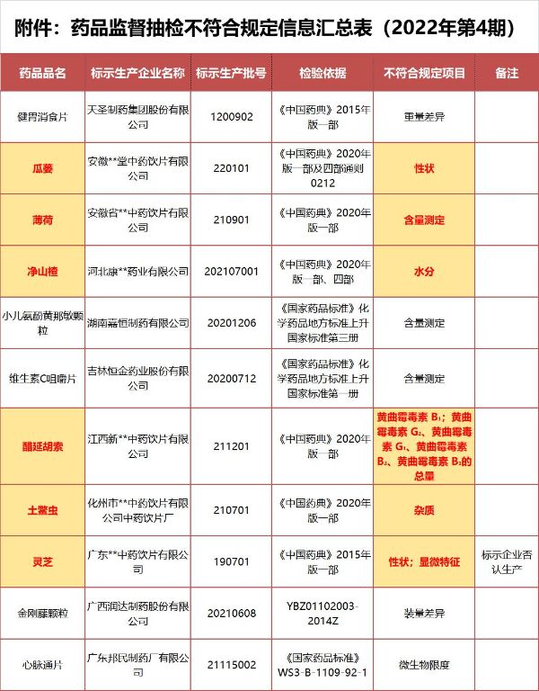 附件:药品监督抽检不符合规定信息汇总表(2022年第4期)