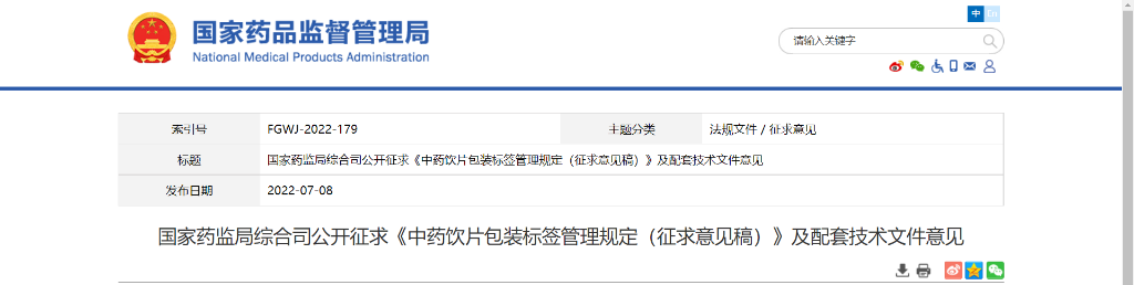 国家药监局综合司公开征求《中药饮片包装标签管理规定(征求意见稿)》及配套技术文件意见