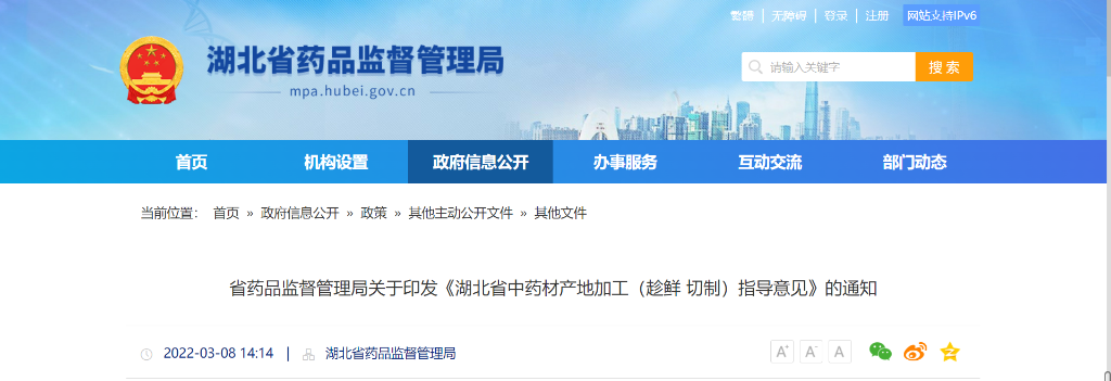 近日,湖北省药监局发布《湖北省中药材产地加工(趁鲜切制)指导意见》,将川牛膝、天麻、木瓜、白及、白茅根、陈皮、黄连列入了湖北省产地加工 (趁鲜切制 )中药材品种目录 ( 第一批),同时发布了湖北省中药材产地加工(趁鲜切制)质量管理指南。