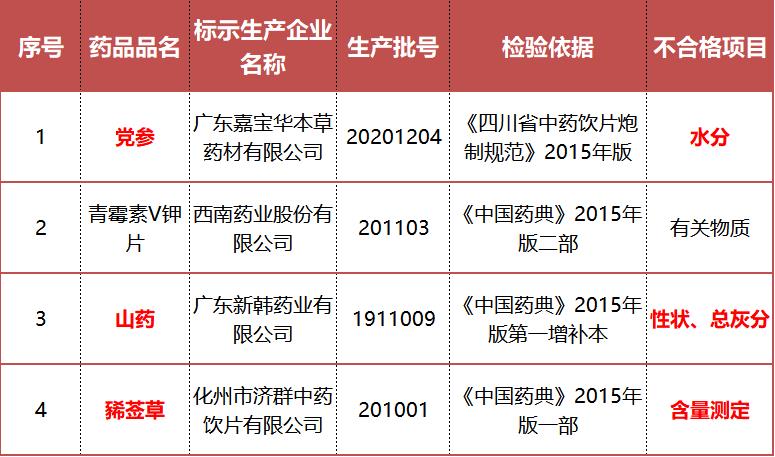 广东药监局发布《广东省药品监督管理局关于药品抽查检验信息的通告(2022年第4期)》,其中4批次产品抽检不符合规定,涉及3个批次的中药饮片:党参(水分),山药(性状和总灰分),豨莶草(含量测定 )。