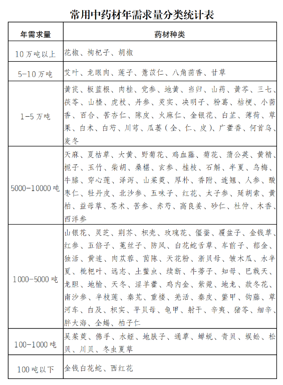 (1)《药典》收载种类:山药、地黄、牛膝、丹参、柴胡、桔梗、白芍、牡丹皮、苍术、白术、百合、白芷、紫菀、薏苡仁、板蓝根【大青叶】、射干、玉竹、半夏、知母、黄芩、远志、菊花、瓜蒌【天花粉】、北沙参、苦参、益母草【茺蔚子】、荆芥、紫花地丁、蒲公英、白附子、黄芪(膜荚黄芪)、黄精、薄荷、艾叶、蒲黄、半枝莲、夏枯草、野菊花、金银花、山楂【山楂叶】、山茱萸、辛夷、杜仲【杜仲叶】、槐花【米】、苦杏仁、桃仁、郁李仁、枸杞子、大枣、连翘、桑白皮【桑叶、桑枝、桑椹】、银杏叶【白果】、木瓜、玫瑰花、酸枣仁、柏子仁、南五味子【滇鸡血藤】、五加皮、皂荚刺【大皂荚、猪牙皂】、穿山龙、虎杖、南沙参、徐长卿、白头翁、白薇、补骨脂、墨旱莲、漏芦、猫爪草、小蓟、蒺藜、白茅根、芦根、旋覆花、香附、苍耳子、马齿苋、蛇床子、萹蓄、茜草、升麻、茵陈、翻白草、薤白、香加皮、葛根、茯苓、猪苓、灵芝、天麻、菟丝子、千金子、冬凌草等。