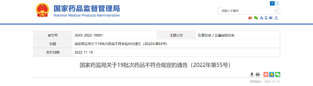 国家药监局关于19批次药品不符合规定的通告(2022年第55)