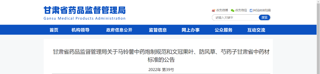 甘肃省药品监督管理局关于马铃薯中药炮制规范和文冠果叶、防风草、芍药子甘肃省中药材标准的公告
