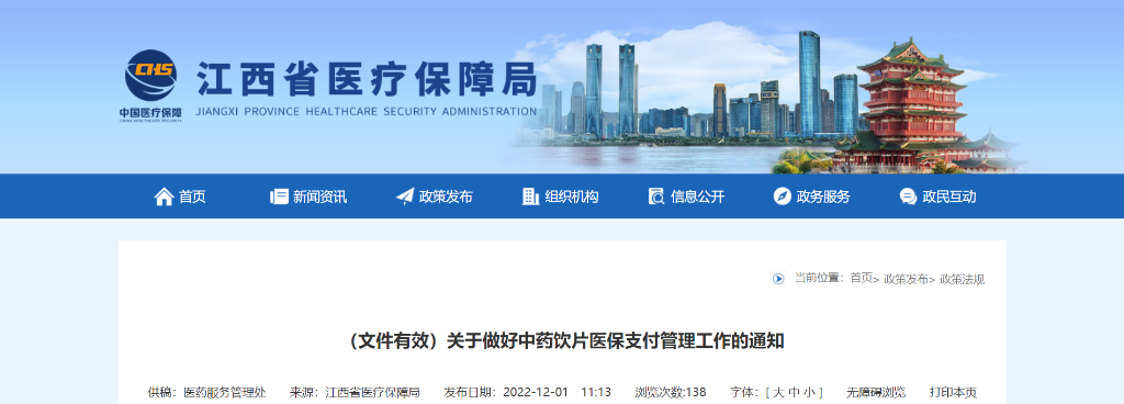 12月1日,江西省医保局发布《关于做好中药饮片医保支付管理工作的通知》。