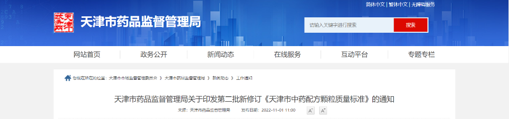 11月1日,天津市药监局发布了第二批白蔹等72个天津市中药配方颗粒质量标准,自发布之日起执行。