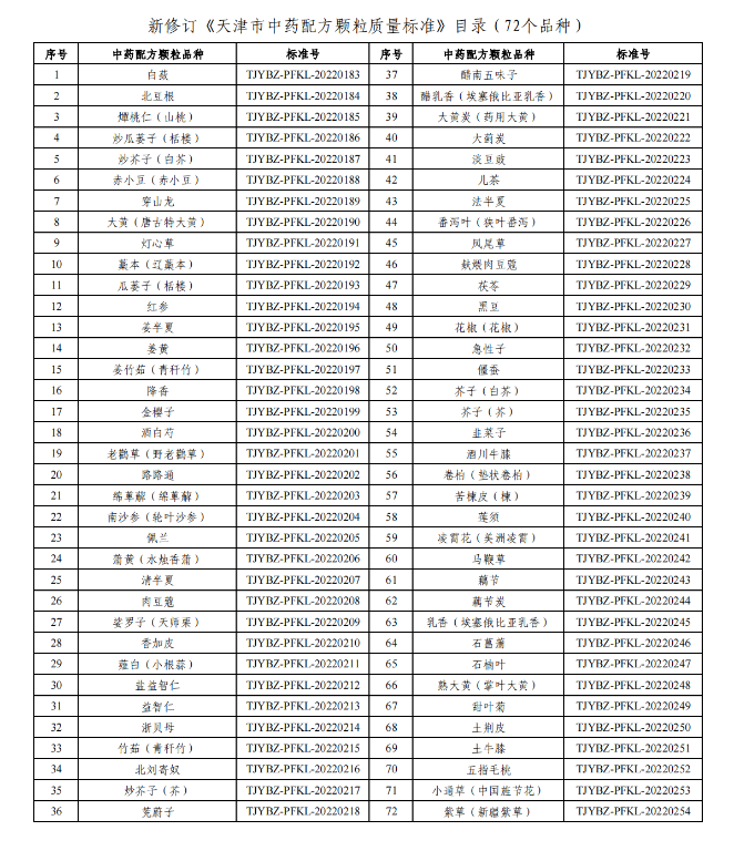 1、新修订《天津市中药配方颗粒质量标准》目录(72个品种)
