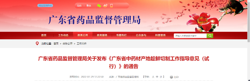 2022年7月29日,广东省药品监督管理局关于发布《广东省中药材产地趁鲜切制工作指导意见(试行)》,指导意见自发布之日起试行,试行期2年,同时还发布了广东省中药材产地趁鲜切制风险管控品种目录。
