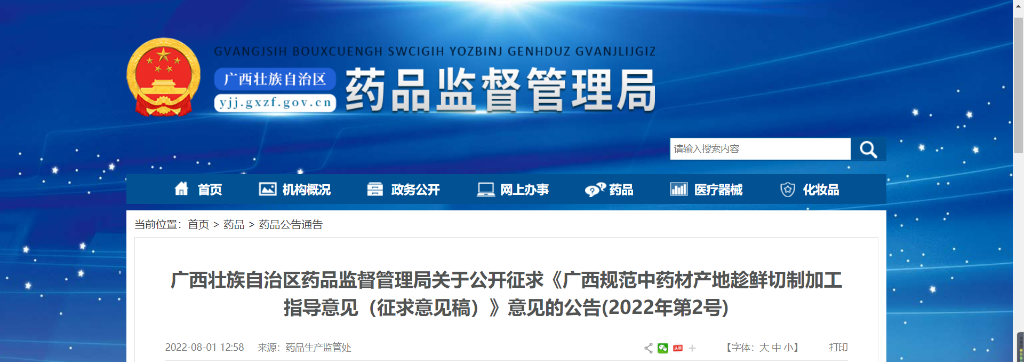 广西壮族自治区药品监督管理局关于公开征求《广西规范中药材产地趁鲜切制加工指导意见(征求意见稿)》意见的公告(2022年第2号)