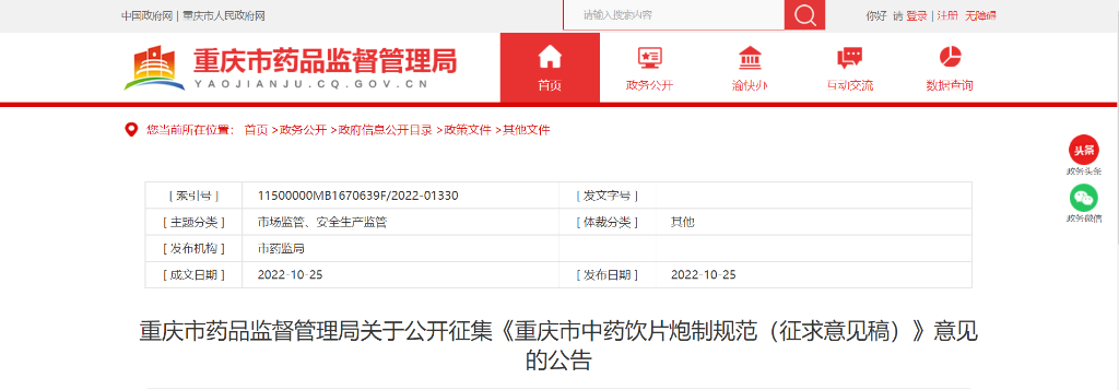 重庆市药品监督管理局关于公开征集《重庆市中药饮片炮制规范(征求意见稿)》意见的公告