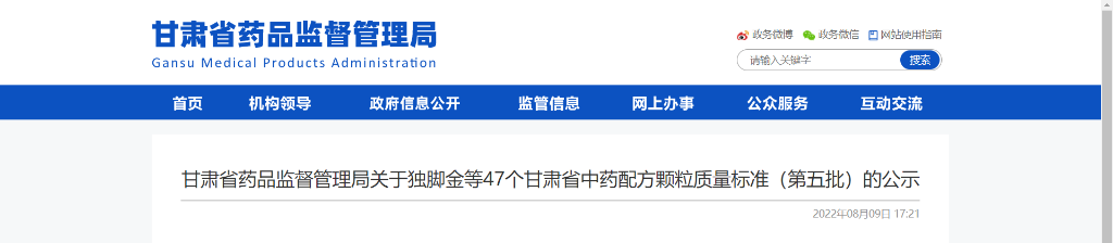 甘肃省药品监督管理局关于独脚金等47个甘肃省中药配方颗粒质量标准(第五批)的公示