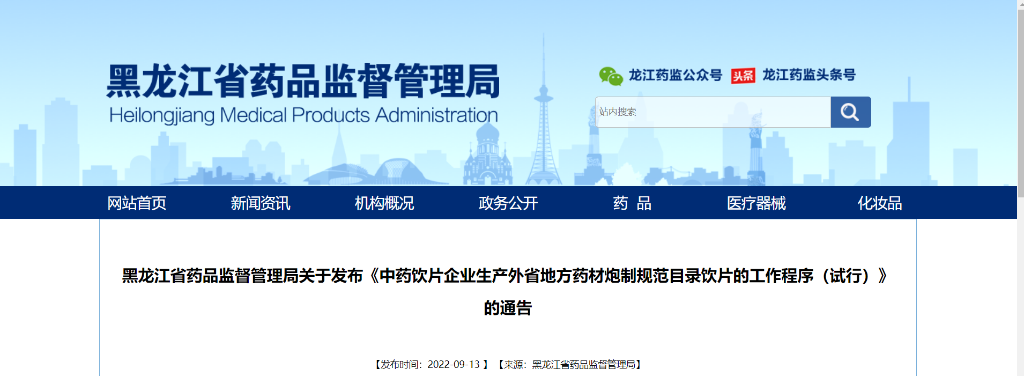 依据黑龙江省药品监督管理局印发《关于支持生物医药产业高质量发展若干措施》的通知(黑药监〔2019〕177号),结合国家药监局关于中药饮片(含中药配方颗粒)的最新精神,经审核同意后省内的中药饮片企业生产外省地方药材炮制规范目录中的饮片。