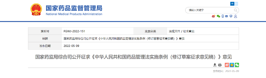 >> 5月9日,国家药监局综合司公开征求《中华人民共和国药品管理法实施条例(修订草案征求意见稿)》意见 。