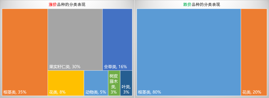 (1)本期上涨价品种共计37个,下跌品种共计5个,另有106品种与上期保持持平。价格上涨品种与下跌品种的数量比值大于7:1,其中涨价品种中根茎类数量占比35%,如白术、北沙参、高良姜、浙贝母、石菖蒲、红参等;跌价品种中根茎类药材数量占比80%, 如:天麻、郁金、皂角刺、重楼等。