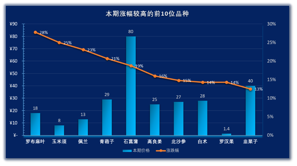 (1)本期价格行情上涨品种的前10位主要有:罗布麻叶、玉米须、佩兰、青葙子、石菖蒲、高良姜、北沙参、白术、罗汉果、韭菜子等。