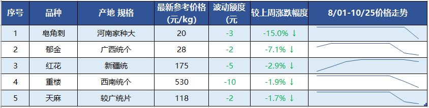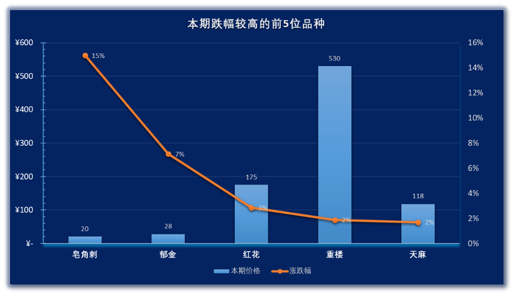 (1)本期价格行情下跌的10位品种主要有:皂角刺、郁金、红花、重楼、天麻等。