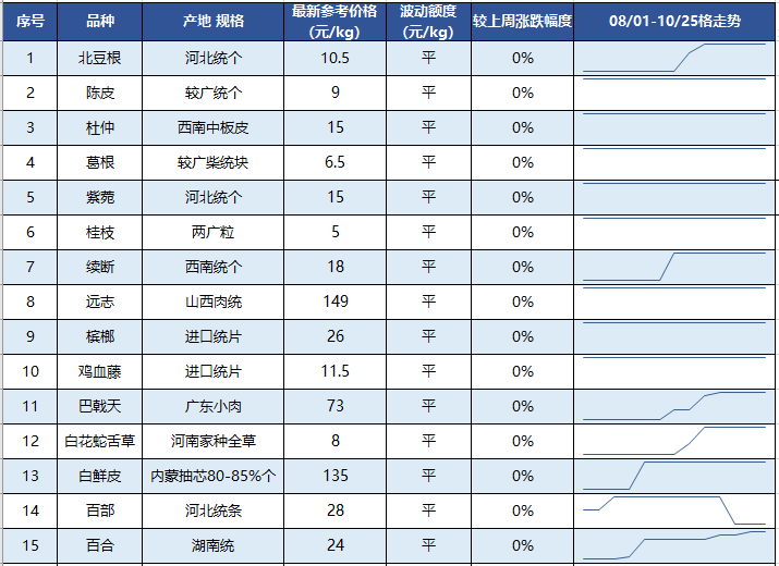 (1)本期价格行情平稳品种主要有:北豆根、陈皮、杜仲、白鲜皮、百部、百合等。