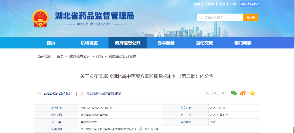 关于发布实施《湖北省中药配方颗粒质量标准》(第二批)的公告