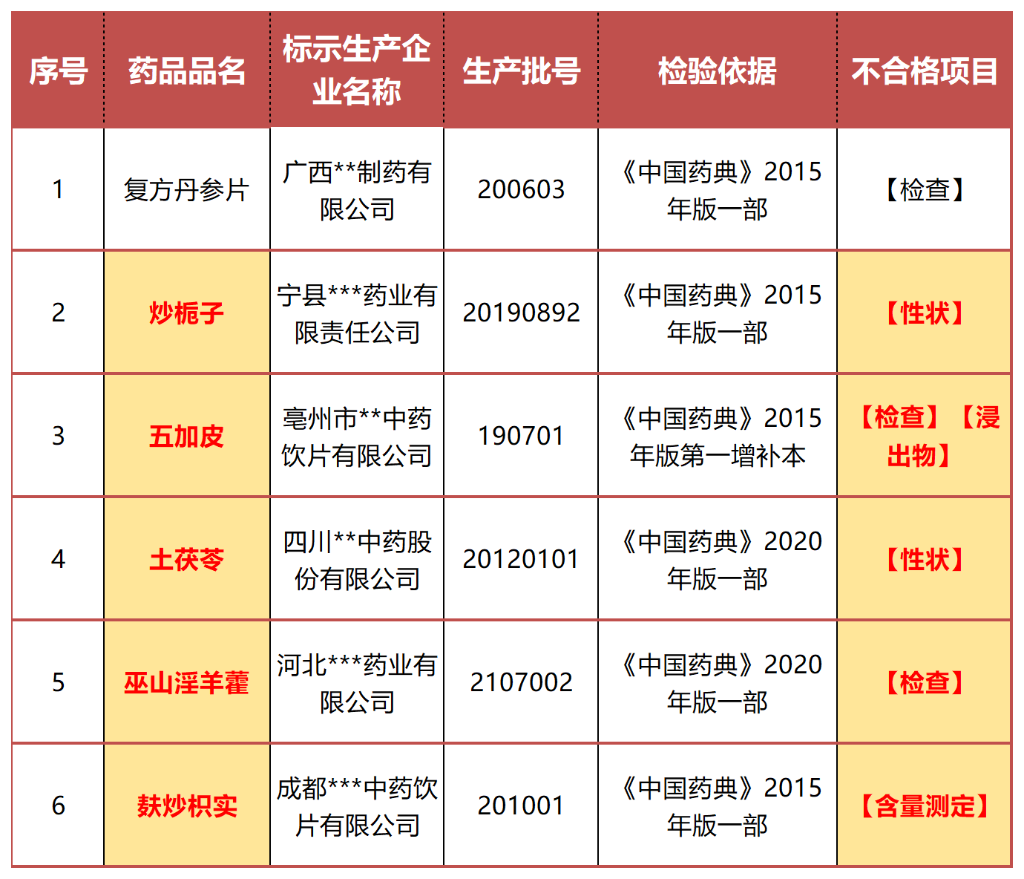 ?近日,陕西省药监局发布《陕西省药品质量公告(2022第3期,总第28期)》,6批次药品不符合规定,包括5批饮片:炒栀子(性状),五加皮(检查、浸出物),土茯苓(性状),巫山淫羊藿(检查),麸炒枳实(含量测定)。