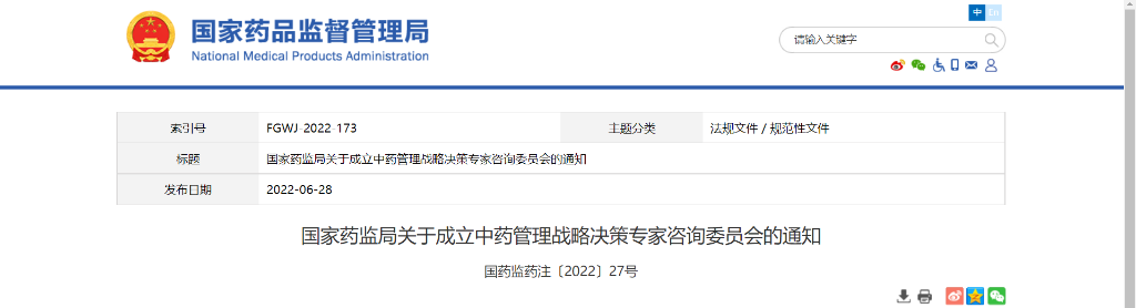 6月28日,国家药监局发布了《国家药监局关于成立中药管理战略决策专家咨询委员会的通知》。