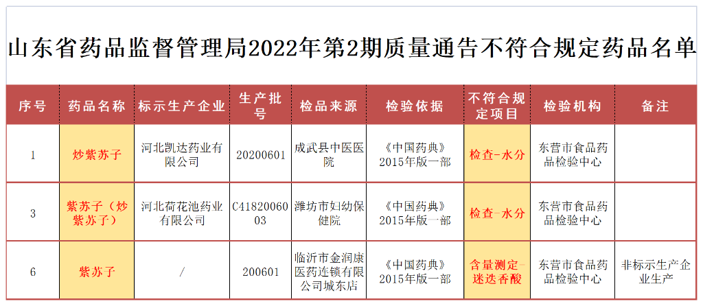 10月10日,山东省药监局发布《山东省药品监督管理局药品质量抽检通告(2022年第2期)》,共3批饮片抽检不合格:炒紫苏子(检查-水分)、紫苏子(炒紫苏子)(检查-水分)、紫苏子(含量测定-迷迭香酸)。