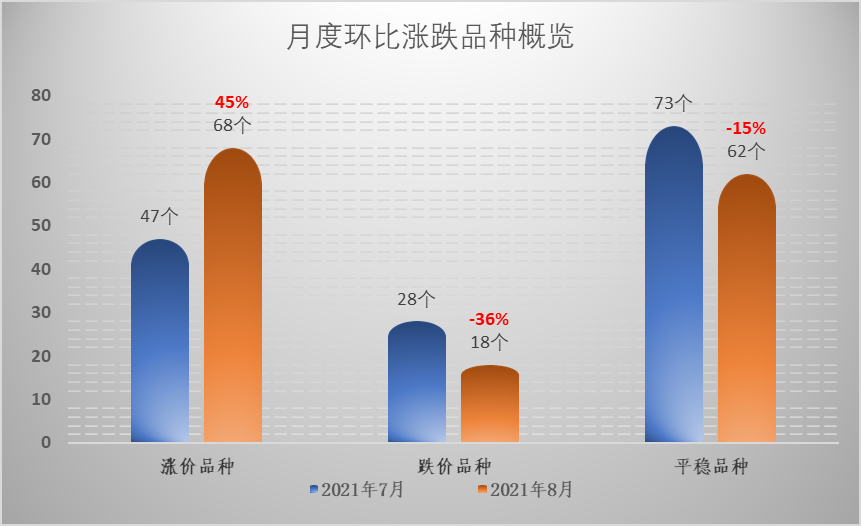 (一)本月监测的148个品种中,出现上涨的品种共计68个,环比上月增加45%,出现下跌的品种共计18个,环比上月下降36%,另有62个品种保持平稳运行,环比上月下降15%。