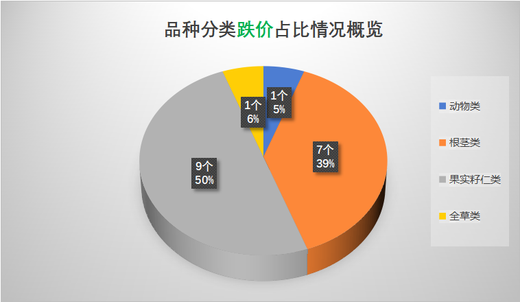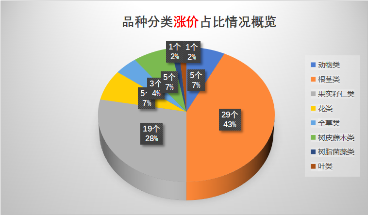 (二)上涨与下跌品种数量比值接近4:1,其中涨价品种中根茎类药材数量占比43%,如:白术、白芷、地黄、党参、当归、防风、知母等;跌价品种中果实籽仁类药材数量占比50%,如:八角茴香、豆蔻、胖大海、车前子、砂仁、吴茱萸等。
