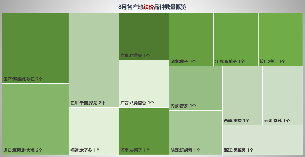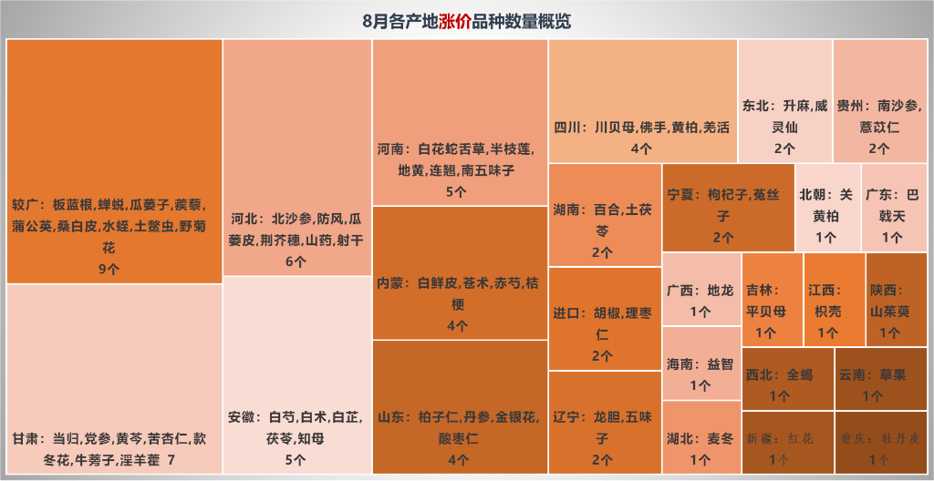 党参:受产地死苗现象严重,致使关注商明显增多,近期产地走销顺畅,价格上涨幅度较大,甘肃小条8月底参考价格50元/kg左右,环比上涨42.9%。