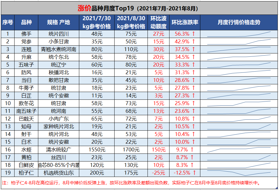 升麻:产地来货量较少,关注药商不断增多,行情持续上升,东北统个8月底参考价格78元/kg左右,环比上涨34.5%。