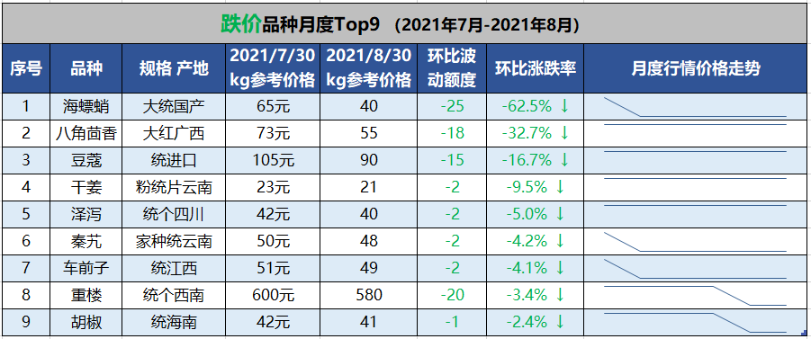 (二)本月价格行情下跌前9的品种主要有:海螵蛸、八角茴香、豆蔻、干姜、泽泻、秦艽、车前子、重楼、胡椒等。